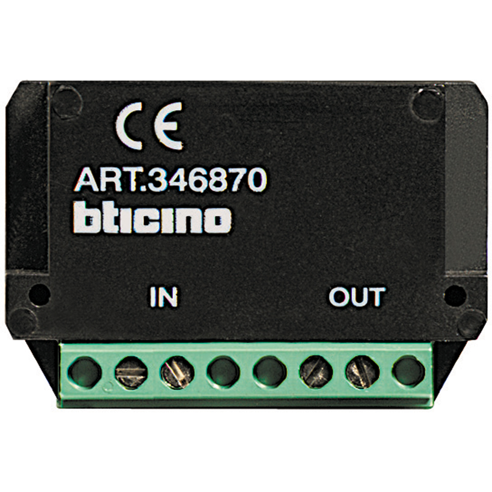 Videosignal-Verstärker für das Bticino 2-Draht-Bussystem, zur Montage in UP-Dose 60 mm, mit einem Eingang und einem Ausgang. Dieser Verstärker ermöglicht eine Videoübertragung bis zu 100 Meter - zwischen der Türstation und dem letzten Monitor - über unverdrillte Kabeltypen. Abmessungen: 40 x 40 x 18 mm